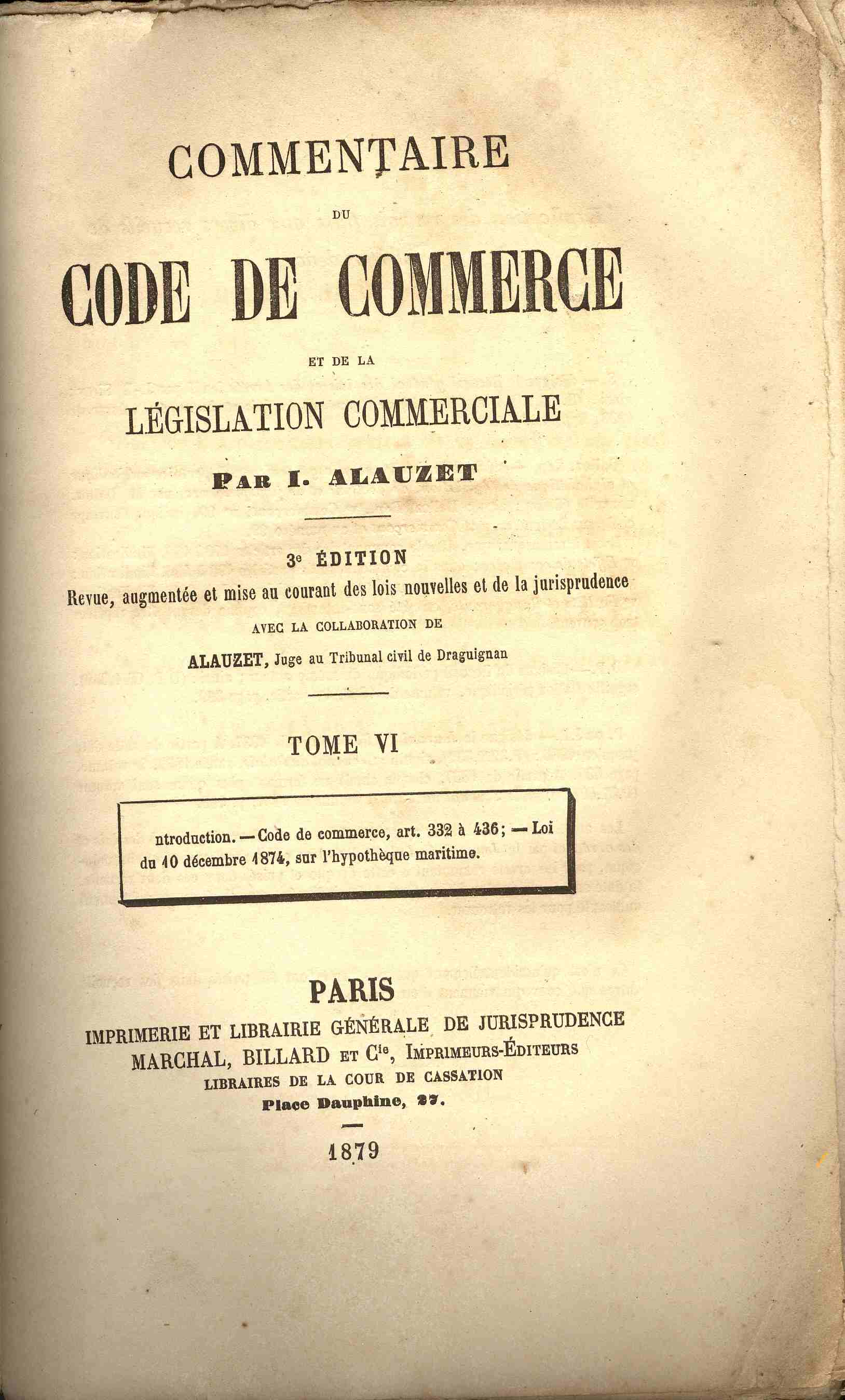 Titre complet : Commentaire du Code de Commerce Tome VI - Articles 332 à 436 du Code de Commerce + Loi sur l'hypothèque Maritime de 1874 Auteur : Isodore ALauzet Perillier Langue : Français Éditeur : Librairie Générale de Jurisprudence (1879) Format : Broché - 620 pages ISBN : Dimensions (en cm) : 14 X 22 cm Prix : Occasion uniquement