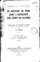 Titre complet : Du Recours de Tiers dans l'Assurance sur Corps de Navires Auteur : JC Carles Langue : Français Éditeur : LGDJ (1936) Format : relié - 458 pages ISBN : Dimensions (en cm) : 16,5 x 25 cm Prix : Occasion uniquement (disponible en PEB par le SUDOC)