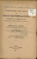 Titre complet : L'assurance par l'Etat des Risques Maritimes de Guerre pendant la guerre 1914-1918 Auteur : Michel Stourm Langue : Français Éditeur : Jouve et Cie (1926) Format : Broché - 260 pages ISBN : Dimensions (en cm) : 17 x 24cm Prix : Occasion uniquement (disponible en PEB par le SUDOC)