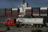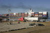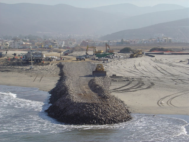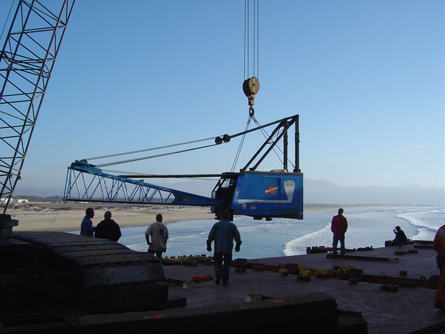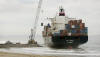 Jetty first is built to stranded ship By Sandra Dibble The container vessel APL Panama, stranded since Christmas Day off an Ensenada beach, now has its own jetty. Salvors commissioned the 500-foot rock-and-sand ramp and hired a giant crane to carry containers ashore. The operation is the latest in a series of attempts to lighten the ship's load and get it floating again. Weighed down by cargo and pinned in by sand, the 880-foot APL Panama has refused to leave the broad sandy beach where it ran aground more than seven weeks ago. The ship was on a trans-Pacific route, and its cargo included electronic components for Baja California manufacturing plants as well as parts for car factories in central Mexico. The delay in delivery prompted Nissan, the Japanese car manufacturer, to stop producing vehicles for three days last week at its Aguascalientes facility. Led by Florida-based Titan Maritime LLC, salvage efforts since the grounding reportedly have succeeded in moving the bow 35 degrees, about a third of the distance necessary to pull it away from shore. A major effort late last month involved six tugboats and a barge equipped with hydraulic pullers, with a combined capacity of more than 80,000 horsepower. Yesterday, as onlookers gazed from a distance, containers were hooked to the crane and lifted off the ship. The crane swung each container over to a waiting truck, where a worker maneuvered it into place. The Baja California construction company Amaya Curiel y Cia S.A. de C.V. built the jetty. Company President Roberto Curiel said yesterday the 300-ton crawler crane, with a 250-foot boom, has been working around the clock since Sunday, and moving up to 60 containers per day. About 1,500 containers were on board yesterday, said Mike Hanson, spokesman for the ship's owner. Leaders of the salvage effort had hoped they wouldn't have to resort to the costly land-based operation. They initially relied on a Sikorsky Sky Crane helicopter to remove some of the lighter containers from the ship. But many of the boxes weigh more than the helicopter's 20,000-pound carrying capacity. Titan Maritime executives have told local officials that they are also hoping to bring in a more powerful helicopter, a Russian-made Mil-25 to lift the heavy containers. But the helicopter had yet to make an appearance yesterday. Capt. José Luis Ríos Hernández, Ensenada's harbor master, said renewed pulling efforts are expected during the next few days. Salvage workers must not only remove cargo, but also find ways to remove the sand that is trapping the vessel. Meanwhile, the delay has had its consequences in central Mexico. Nissan was missing parts that were in about 100 containers, and as a result, did not produce vehicles on Jan. 30, 31 and Feb. 1 at its 5,000-employee facility in Aguascalientes, said Fred Standish, director of corporate communications for Nissan North America Inc. Alternative supplies were found, and production resumed last Thursday, Standish said. “It's been running full steam ever since.”