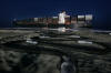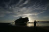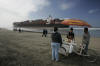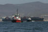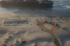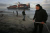 It is learned that draft is 12mt. where red & black paint meet. at 2mt. to water - with 1.5mt. of water at the vessel & 8.5mt. of ship in sand. Geeez! Perhaps M/V APL Panama is better made a permanent resort. Workers in recent days removed some 1,500 pounds of tainted sand from Conalep Beach, near a residential neighborhood south of the Ensenada port. Ship appears to have caused no significant environmental damage. The majority of the fuel on the vessel &endash; about 3,000 tons &endash; was pumped out last week at the request of Mexican officials, who have feared that damage to the vessel could result in a leak. Later this week, a barge fitted with powerful hydraulic pulling machines is expected to arrive in Ensenada to double the tugs' power.